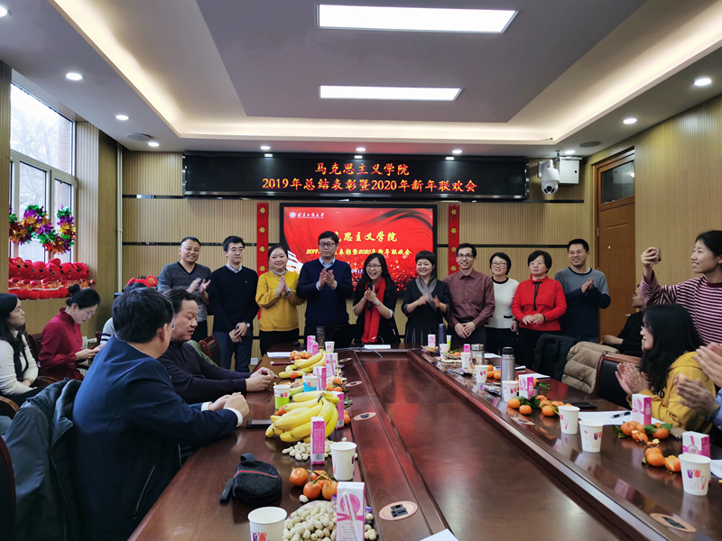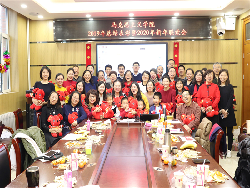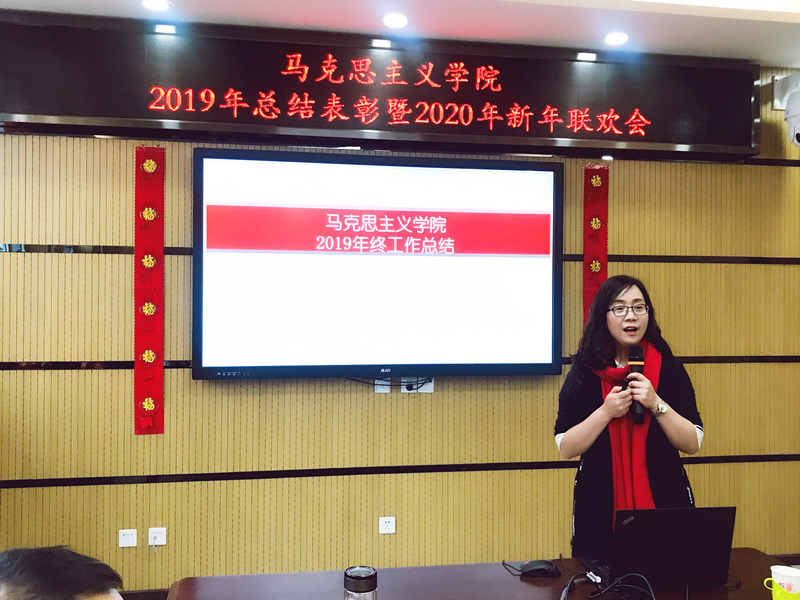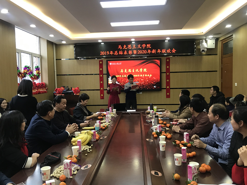 总结会后,联欢会在集体联袂拜年祝福中拉开帷幕,学院领导、经理助理和各教研室主任真诚祝愿大家在新的一年收获满满,梦想成真;现场欢声笑语,洋溢着浓厚的节日气氛。学院教职工演绎了音乐、舞蹈、武术、诗朗诵、情景剧、游戏等形式多样的精彩文艺节目,集中展现了马院人浓厚的家国情怀和深厚的艺术积淀,获得了现场的阵阵掌声和热烈喝彩。歌曲《哲学有点甜》、《悦来悦好》、《好汉歌》和《沿着社会主义大道奔向前》,诗朗诵《七律·到韶山》、《七律·到马院》、《这一年》,舞蹈《网络热舞串烧》,情景剧《好FUN不怕晚》等节目精彩纷呈,充分展现了马院人的才艺智慧和精神风貌,祝福马院人在奋力拼搏的新征程中茁壮成长,再创辉煌。联欢会在全体大合唱《相亲相爱一家人》的歌声中落下帷幕。