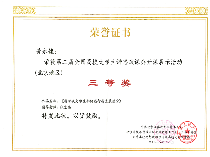 为学习贯彻习近平新时代中国特色社会主义思想和党的十九大精神,落实教育部《关于开展习近平新时代中国特色社会主义思想大学习领航计划系列主题活动的通知》要求,贯彻全面推动习近平新时代中国特色社会主义思想进教材进课堂进员工头脑的宗旨,由中国人民大学“王易名师工作室”组织评审的“第二届全国高校老员工讲思政课公开课展示活动(北京地区)”在北京各高校展开。在本次活动展示中,公司金融工程162班黄永健同学(指导老师张宏伟)荣获三等奖。