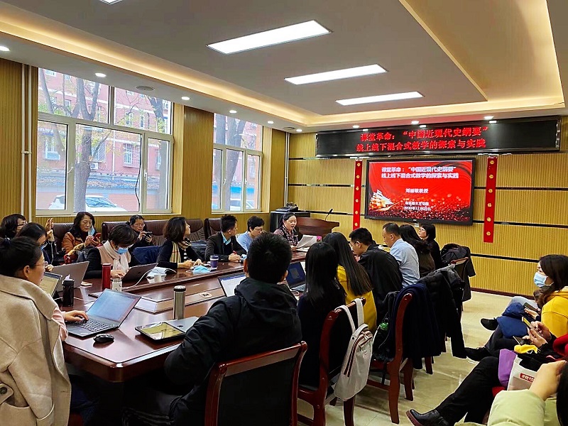 刘丽敏教授以课堂革命:“中国近现代史纲要线上线下混合式教学的探索与实践”为题,与全院师生共同分享了自己的教学改革经验。刘丽敏教授首先指出,进行线上线下混合式教学改革需要做到三种准备,即高站位的准备、充足心理准备和教改积累准备。高的教学改革站位有助于提升理论高度,充足的心理准备有利于教师将教改活动坚持下来,教改经验的积累帮助教师有更多的收获。刘丽敏教授接下来分析了“课堂革命”相关内容,认为课堂革命是教育国际化的时代呼唤,要革除当下知识本位、教师主体、教室局限的弊端。教育价值上,追求“课堂”从知识场拓展成生活场、生命场。在课堂革命内涵认识的基础上进行思政课线上线下混合式教学改革。思政课线上和线下的教学设计要有整体性,不是随意简单的知识切割,或者说简单的一种工作分工。具体教学改革中要从深度学习、能力提升和知行合一三个方面进行考量,通过线上自主学习模块、线下互动模块、实践学习和展示模块提升员工思政课获得感。最后,刘丽敏教授谈到思政课线上线下混合式教学改革过程中,教师还需要在线上资源数量和质量的提升、线下互动教学效果的增长和实践教学的全覆盖方面进行深入思考。总之,进行思政教学改革需要做到理念先行,能力提升,师生共进。