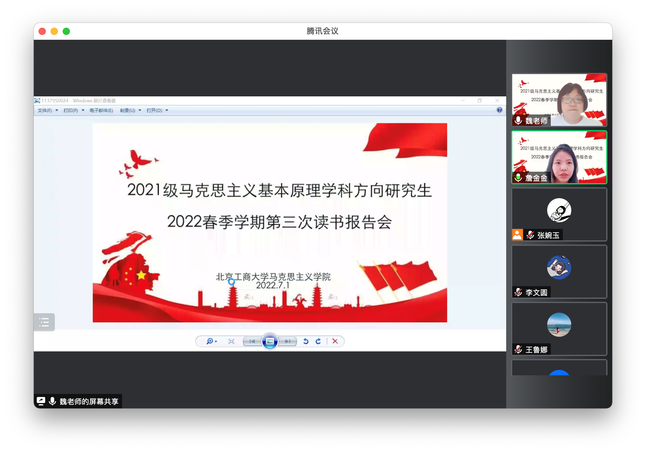 7月1日上午,学院组织2021级马克思主义基本原理方向研究生春季学期第三次读书报告会。经理王鲁娜教授、马克思主义基本原理教研室魏海香老师、李金老师和2021级马克思主义基本原理方向研究生参与了本次读书报告会,读书报告会由魏海香老师主持。