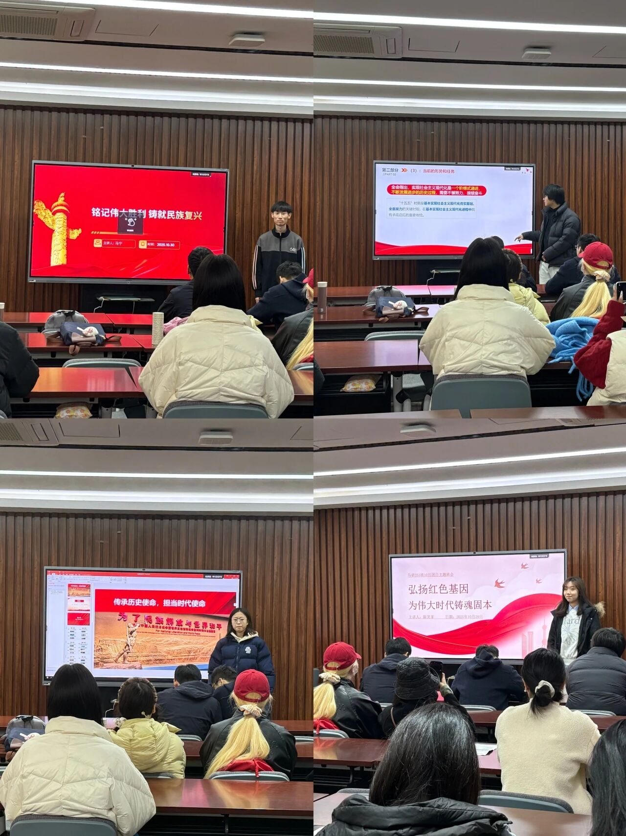廖承禹同学以“志愿青春献给党”为主题,讲述了自己多次参与大型活动保障工作,他将自身服务场景与抗战精神相联结,他呼吁同学们以点滴行动践行青年对党的初心与责任;马宁同学的宣讲既还原抗战历史真相、阐释中国共产党的中流砥柱作用、讲述中国作为东方主战场的世界贡献;张海燕、陈笑菲同学结合自身专业学习,宣讲聚焦中国式现代化新征程上的精神传承,呼吁马院学子自觉做弘扬伟大抗战精神的践行者,在强国复兴新征程中不断砥砺奋进。