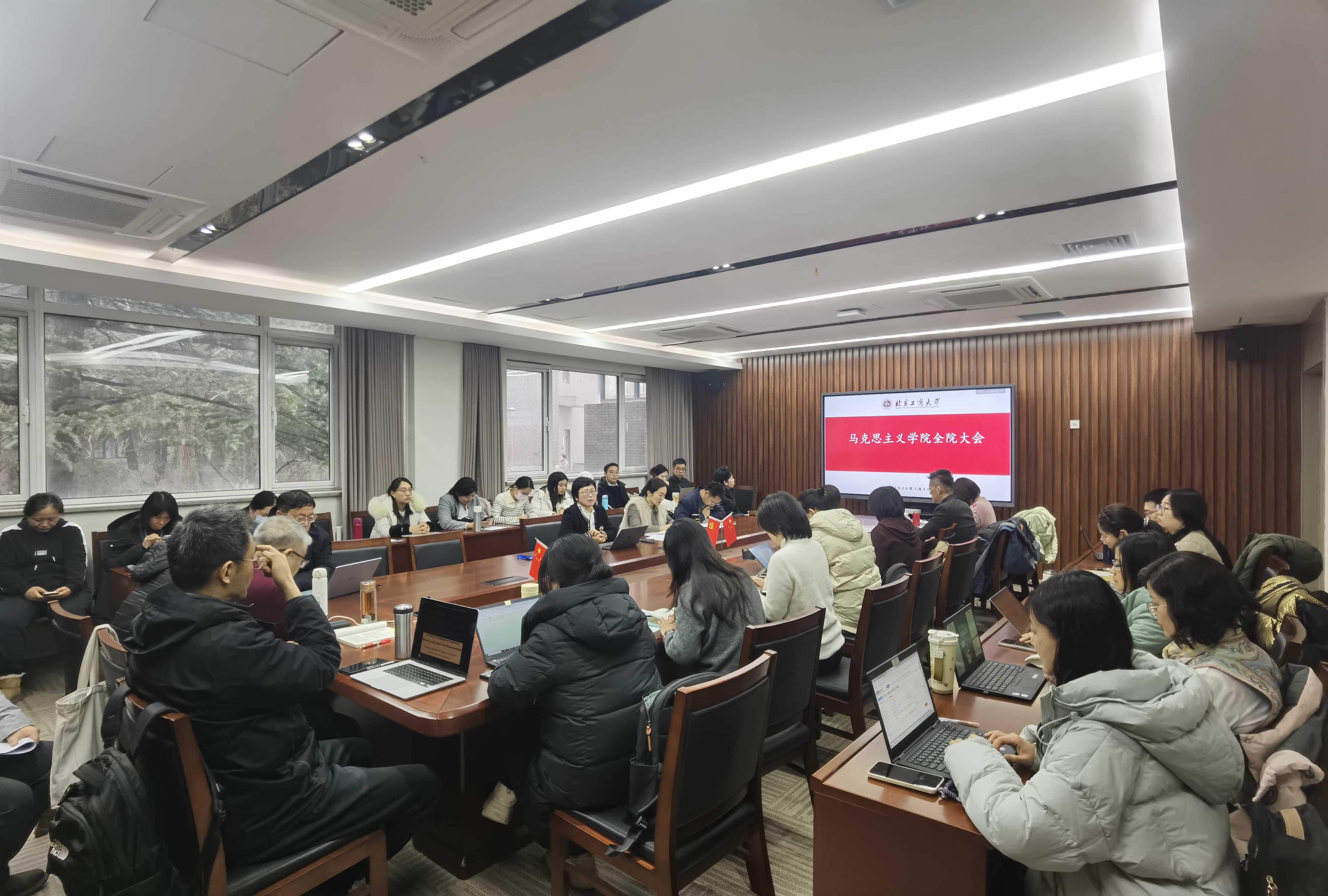 在深化思政课改革创新方面,经理结合北京市重点马院验收意见,对过去一年学院工作进行了全面回顾。学院顺利完成了“大思政课”建设、团队队伍建设、北京市重点马院验收等重点任务,在教学与人才培养、教师发展、公司产品等方面成效显著,在科研与社会服务领域也收获颇丰,同时配合学校两级管理,完成了绩效分配方案的制定与公示。对于新的一年,学院将遵循以点带面、统筹推进的原则,以目标导向、问题导向为指引,主动融入和服务首都发展,牢固树立风险意识和底线思维。在推动公司产品提质增效上,通过实施思政课质量提升工程,推进“一院一课”建设,不断提升思政课教师教学水平,全面服务学校“工商一体化”人才培养目标;在高水平推进团队建设方面,持续提升教师科研能力和团队建设水平。经理还深入剖析了学院当前建设中的堵点、难点,并提出针对性解决方法,总结了聘期内学院教师的任务完成情况,客观分析了学院教师在教学和科研的短板,明确了教师的后续提升方向,她特别强调国家社科基金、教育部社科项目的申报与研究工作,要求全体教师聚焦重点、精准发力,提高项目申报质量;同时指出毕业生就业工作要抢抓优质岗位,引导员工先就业再择业。