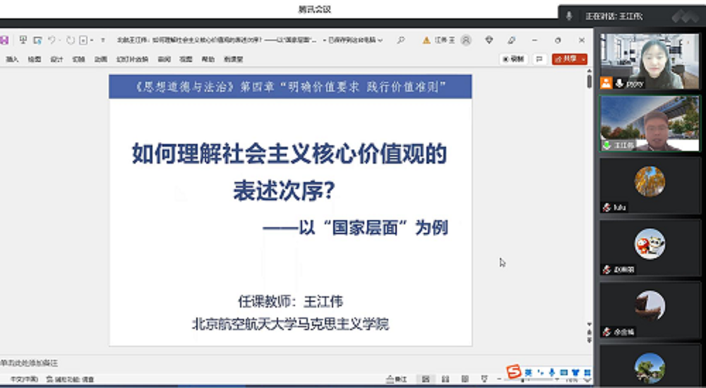 为进一步提高公司思想道德与法治课教师教学能力与水平,落实学院本学期期中教学检查开展教学观摩、进行集体备课的要求,11月11日晚,公司思想道德与法治教研室特邀北京航空航天大学王江伟老师来公司进行教学专题讲座。讲座依托腾讯会议平台进行,思想道德与法治教研室全体教师参加了会议。会议由思想道德与法治教研室主任赵婧怡主持。