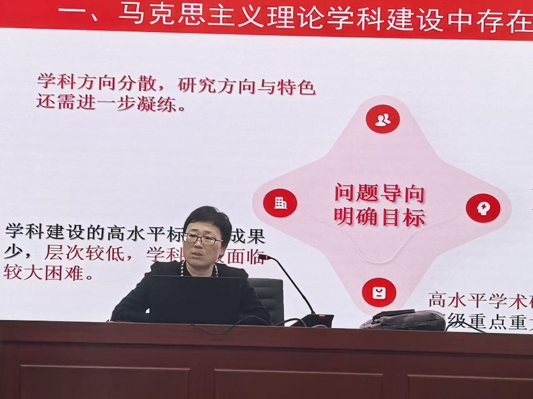 经理在深入剖析学科现状的基础上,按照学校“工商一体化”发展理念和对接国家战略需要、对接首都发展需要、对接行业发展需要的要求,明确提出了引领学院学科未来发展的“三对接”战略路径,并详细阐释了其具体内涵与实践方向。首先,对接教育强国立德树人根本任务的战略需求,以团队建设推动思政课建设提质增效,不断提升思政引领力。其次,对接首都发展实践,深度融入北京“四个中心”功能建设、京津冀协同发展、超大城市治理等区域实践,将理论创新与中国式现代化的首都篇章的具体场景相结合,产出具有鲜明地域特色和实践价值的成果。最后,对接学校和行业发展定位,指出马克思主义理论学科应主动融入学校商科、食品学科等优势学科的生态体系,探索交叉融合、跨学科共研的新增长点,夯实全校思想政治理论课的育人主渠道作用,为培养卓越人才和凸显办学特色提供坚实的思政引领力基础。她呼吁全体教师树立“团队建设共同体”意识,以博士点申报工作为关键抓手,对标对表,精准发力,系统性提升学科整体水平与核心竞争力。