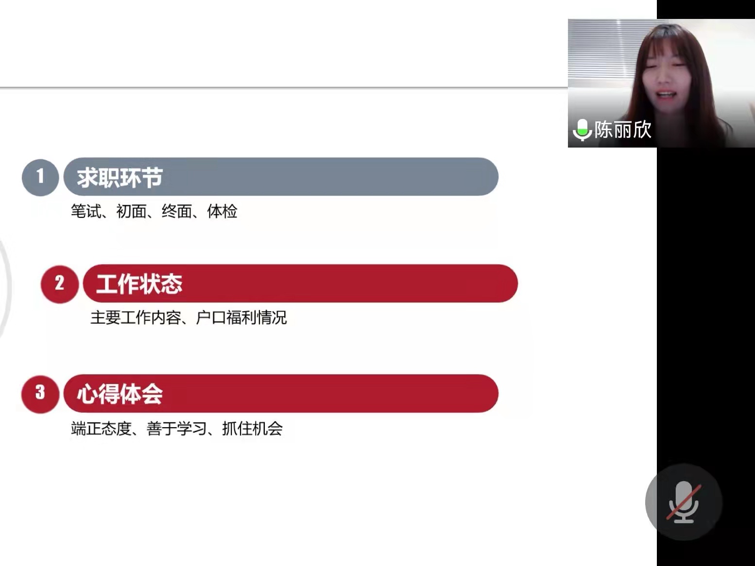 2017届校友陈丽欣,现在中国移动通信集团有限公司信息安全管理与运行中心从事纪检工作。她给学弟学妹们分享了她的求职经历和工作体会,让同学们看到了她对纪检工作的忠诚热爱和深刻理解。她提醒同学们企业对个人素质的要求中最重要的是态度,要有积极工作的态度,有政治立场坚定的态度,有不断虚心学习的态度,并把端正的态度用实际行动表现出来,鼓励同学们善于抓住机会,勇敢面对挑战,守正创新,勇毅前行,努力把自己塑造成高素质高水平的劳动者。