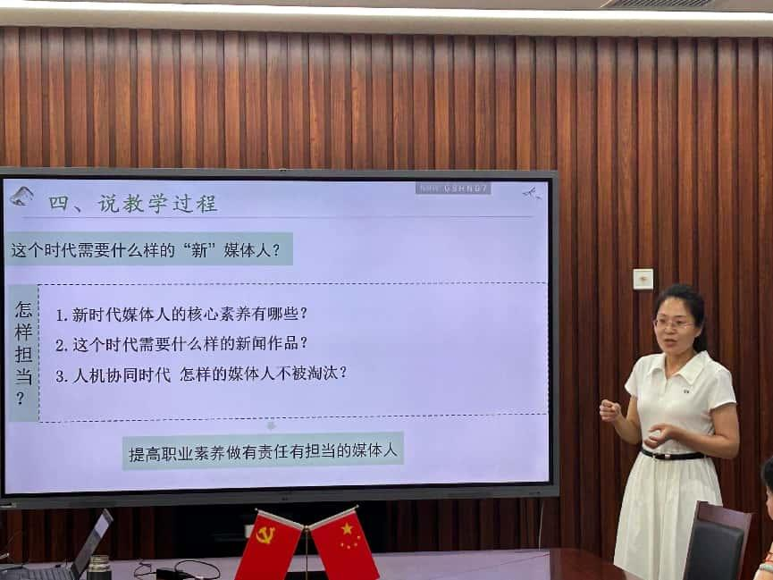 姜茹茹老师聚焦如何给 “新传” 专业员工讲好 “时代责任担当”。她从教材内容、员工学情和教学过程三个方面展开,在教材内容方面,将绪论中标题结合新闻传播专业进行转换;在员工学情分析上,涵盖了员工知识基础、能力基础以及情感价值观情况;在教学过程中,将党的十九大报告提出的,中华民族迎来了站起来、富起来、强起来的伟大飞跃,以更易于新传员工接受的方式开展教学。