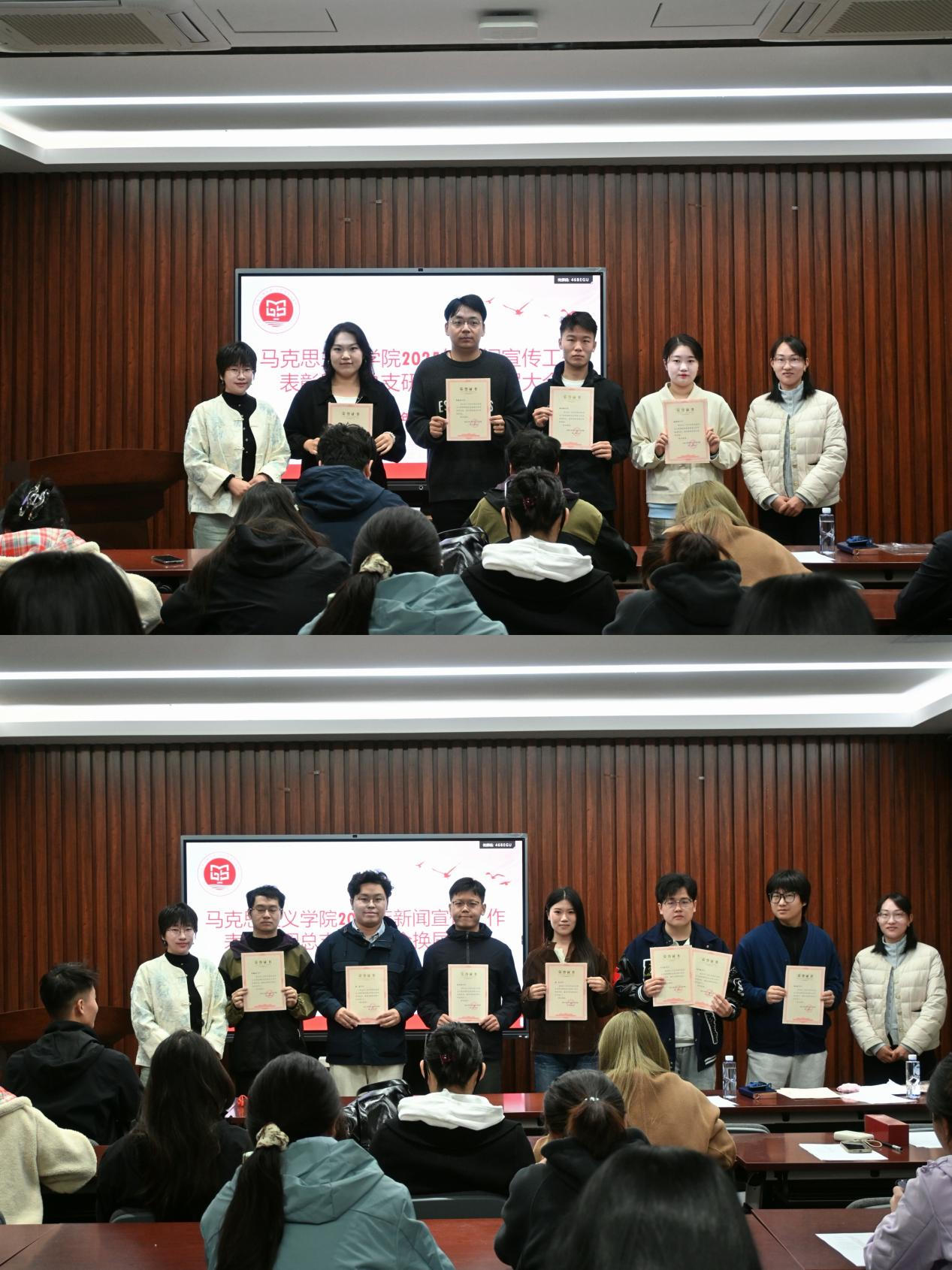 会议对2024-2025学年学院新闻宣传工作先进个人予以表彰。团总支书记来金雅首先宣读获奖名单,向长期坚守新闻宣传一线的同学们表达诚挚感谢。她高度肯定了新闻宣传工作取得的突出成果,对同学们展现的专业素养与执着付出给予充分认可。随后,她向新一届员工干部寄予期望,鼓励大家以获奖同学为榜样,勇担责任、直面挑战,在新闻宣传领域持续奋进,争创更优异的成绩。最后,来金雅老师与刘好老师共同为获得新闻宣传先进个人及优秀奖的同学颁发荣誉证书。