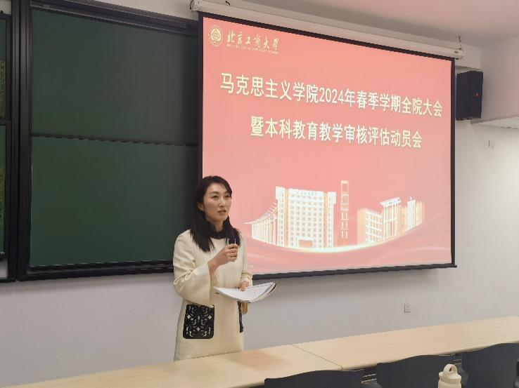 任金晶书记首先传达了学校第三届委员会2024年第一次全体(扩大)会议精神,向各位老师传达了学校高水平研究型大学的定位和创建“双一流”学科的目标愿景,强调要各位老师要围绕学校发展大局谋划自身事业发展。其次做了本科教学评估工作动员讲话。她强调,全院教职工要统一思想认识,认真贯彻落实学校统一部署安排,以本科公司产品评估为契机,全面把握评估工作内涵要求,审视思政课教学管理中的问题,查漏补缺,切实提高工作水平,围绕学校“双一流”团队建设和推进学校高质量内涵式发展贡献力量。